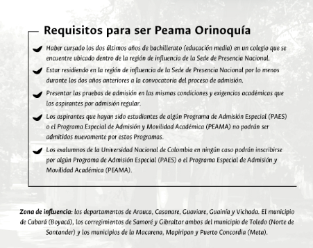 Este formulario que encontraras adjunto tiene como objetivo obtener los datos de los bachilleres de instituciones educativas públicas ubicadas en la zona de influencia de la Sede de Presencia Nacional Orinoquía, que tengan un verdadero interés en participar en el proceso de admisión de la Universidad Nacional de Colombia y que cumplan los requisitos para formalizar la inscripción a través del Peama.